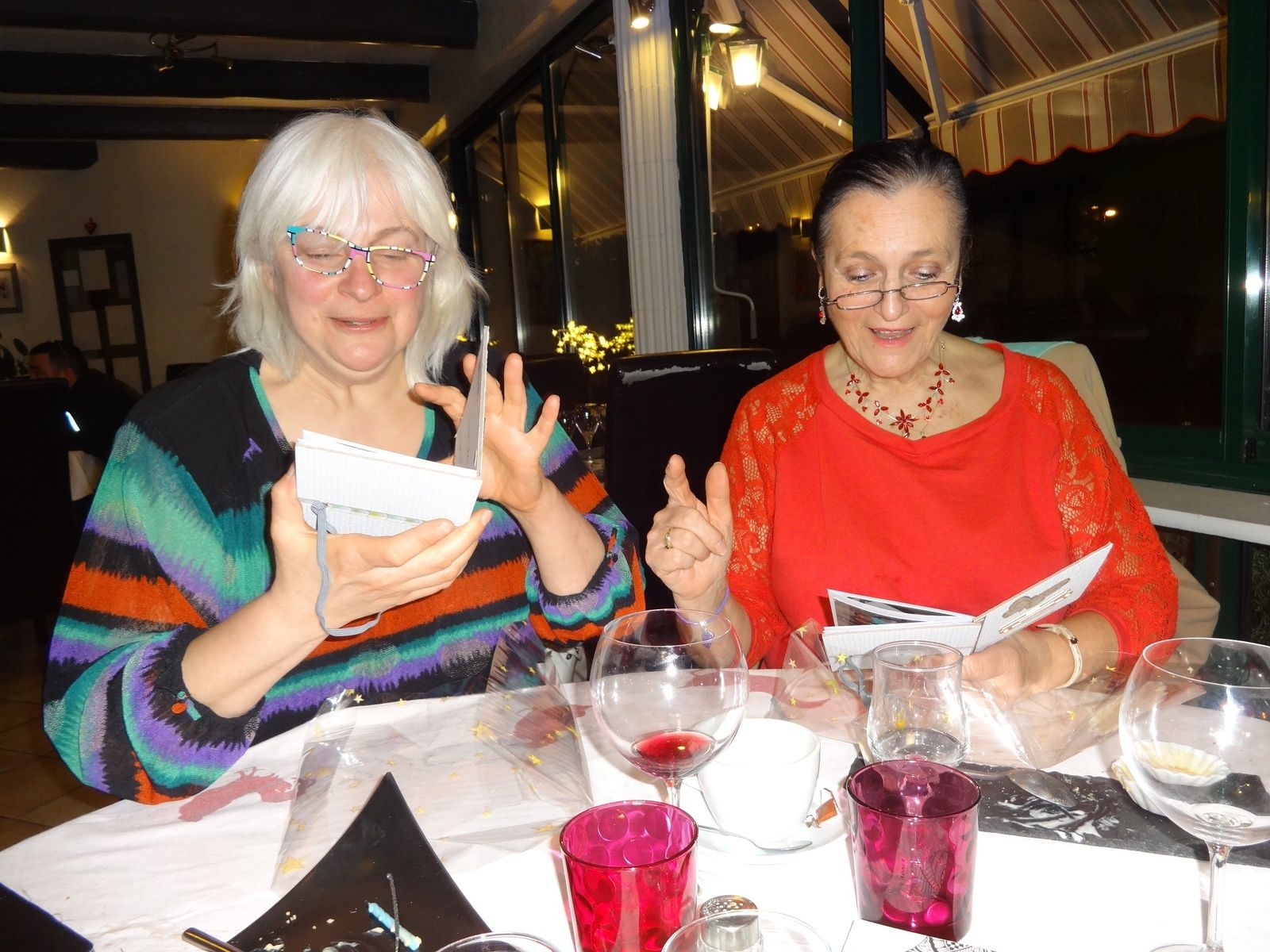 C'était le cas, hier soir, où nous avons fêté comme il se doit les anniversaires groupés de Nathalie (à gauche) et Annette (à droite). Une soirée empreinte d'émotions et de fous rires partagés à l'image de cette photo... D'autant plus drôle que, ce matin, en visionnant mes prises de vue d'hier soir, je ris encore en voyant celle-ci justement où mes chères copines découvrent leur premier cadeau, lunettes sur le nez... de travers!!!!!